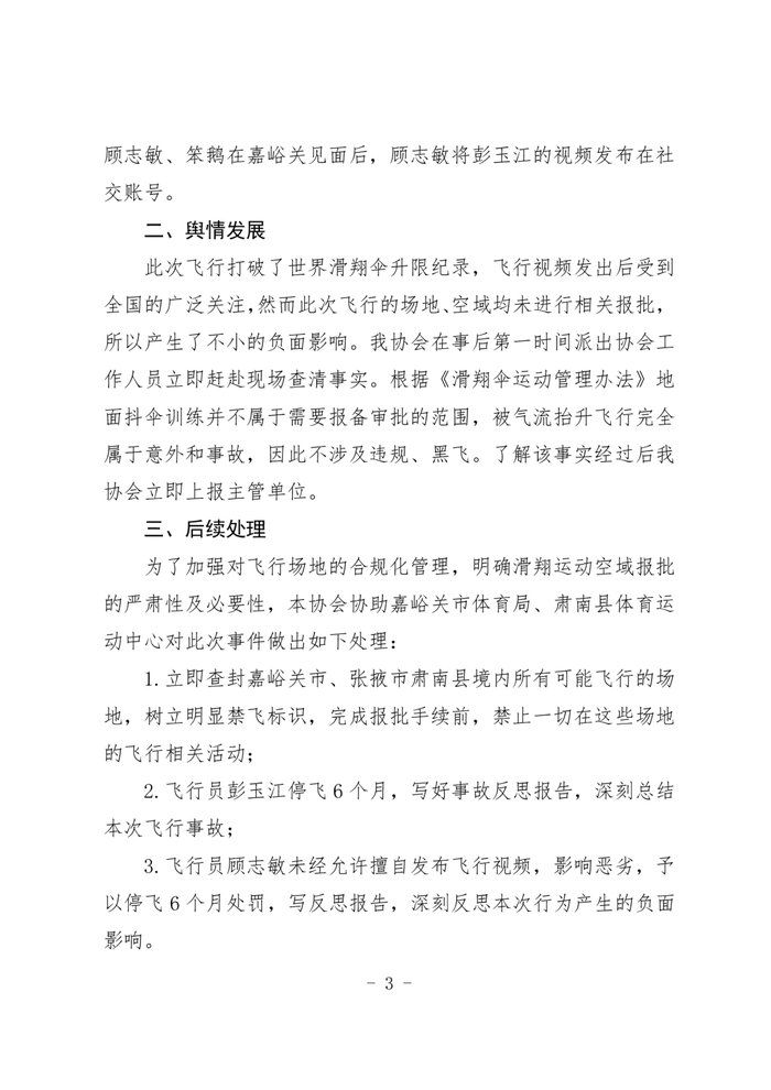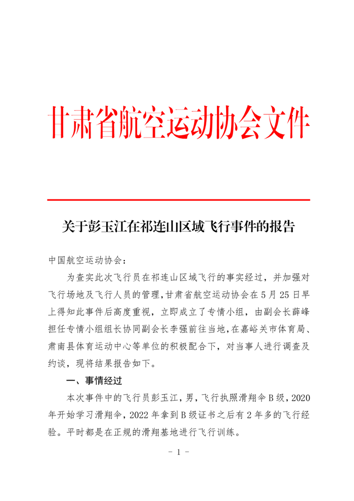 三星证券 甘肃省航空运动协会发布关于彭玉江在祁连山区域飞行事件的报告
