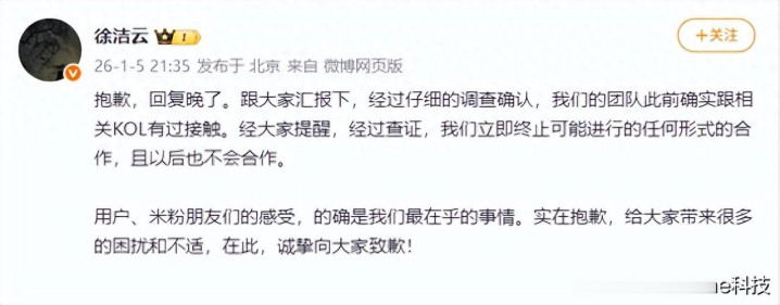 随后,小米集团董事长特别助理、公关部总经理徐洁云对此进行了官方回应,称经过仔细的调查确认,我们的团队此前确实跟相关KOL有过接触。经大家提醒,经过查证,我们立即终止可能进行的任何形式的合作,且以后也不会合作。
